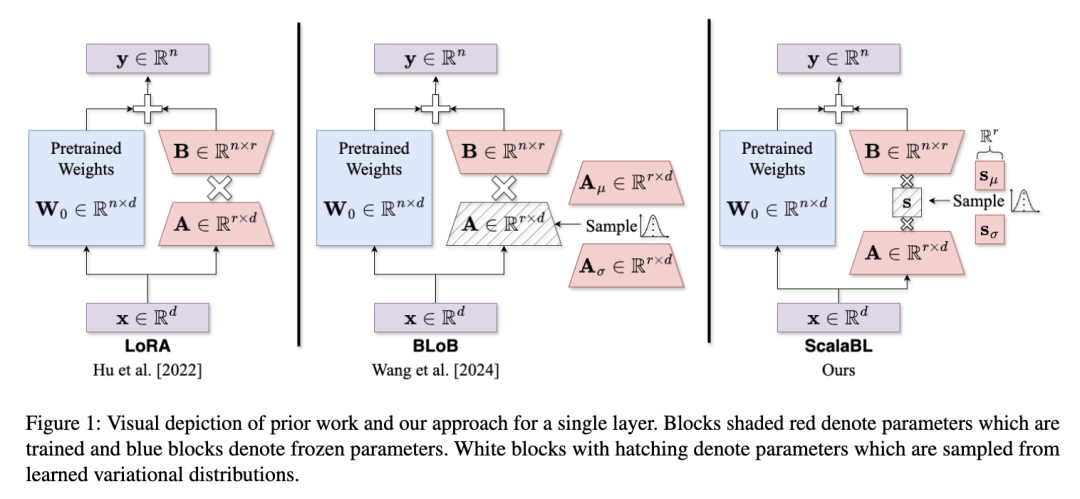 该领域首个成功尝试来自 Yang 等人 [2024a],他们在 MAP 微调后对参数后验分布进行拉普拉斯近似。而 Wang 等人 [2024] 提出的当前最优方法则采用随机变分推理,他们称之为“通过反向传播实现贝叶斯 LoRA”(BLoB)。尽管该方法性能优于此前所有方法,但其所需参数数量比标准 LoRA 多出约 40%,这在高风险、资源受限的部署场景中可能成为严重的内存瓶颈,因为在这些场景中,计算贝叶斯模型平均本身就已经接近可用内存的极限 [Vadera 等, 2022]。