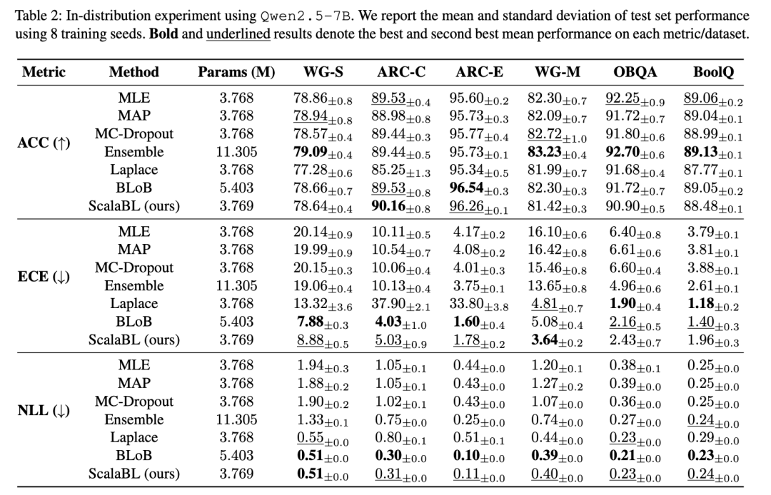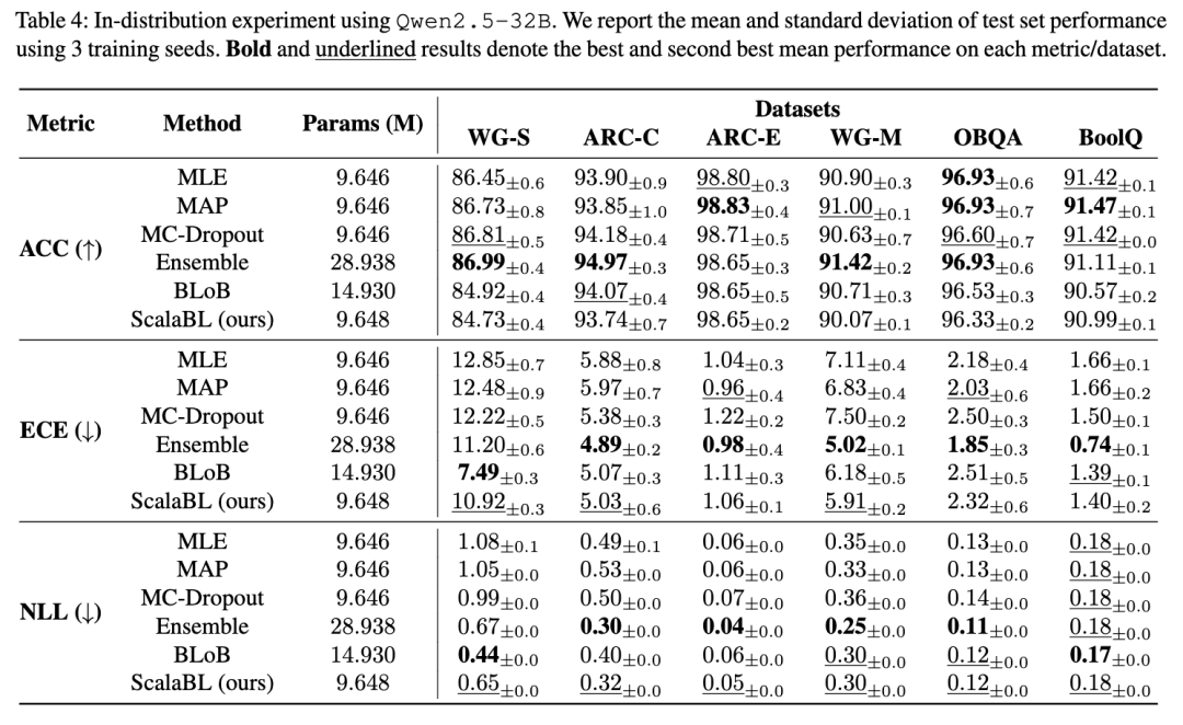 Yang 等人 [2024a] 和 Wang 等人 [2024] 的先前工作存在一个局限性:他们仅使用了相对较小的、仅有70亿参数的大语言模型。这使得其结论是否适用于当前广泛使用的更大规模模型尚不明确 [Anil 等, 2023]。为此,我们将我们的方法扩展到迄今为止最大的贝叶斯大语言模型——Qwen2.5-32B,其基础参数数量是此前工作的四倍。我们进行了与之前相同的分布内实验,测试集结果如表4所示。需要说明的是,我们未报告拉普拉斯基线的结果,因为其事后(post-hoc)计算过程即使在使用8位参数且测试时批大小为1的情况下,仍超出了我们80GB A100 GPU的内存容量,这凸显了该方法在可扩展性方面的严重不足。