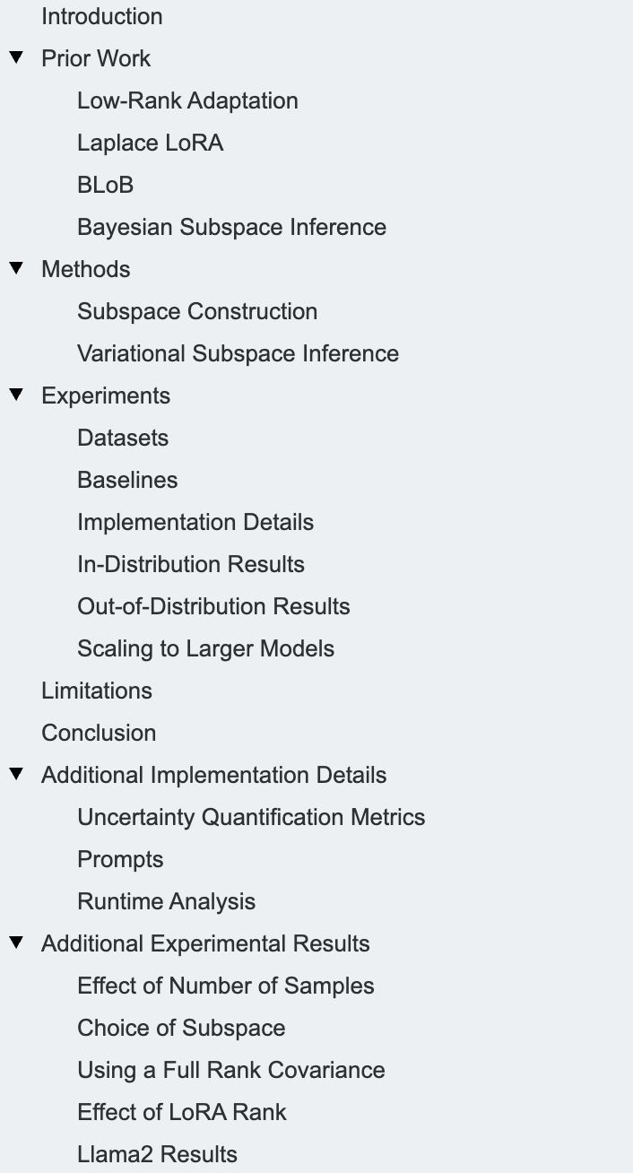本文结构如下:第2节介绍与本工作相关的主要前期研究;第3.1节阐述如何构建参数高效的子空间;第3.2节介绍如何在该子空间中使用随机变分推理训练概率模型;第4节展示广泛的实验结果;第5和第6节讨论局限性并总结全文。更多细节和实验结果见附录。我们的代码已开源:github.com/SRI-CSL/BayesAdapt。