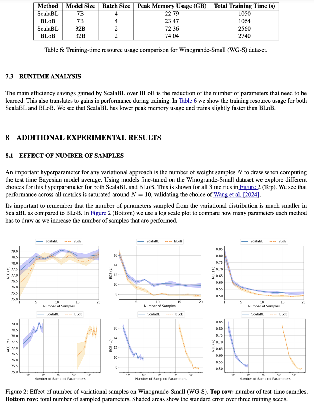 我们方法的一个主要优势是:对于每个LoRA层,仅需学习 2r 个额外的变分参数,而BLoB方法则需要 rd 个(其中 d是大语言模型的嵌入维度)。例如,在对一个拥有70亿参数、嵌入维度 d=3584的大模型进行微调时,若LoRA秩 r=8,BLoB需要数百万个额外参数,而ScalaBL仅需约1000个。此外,只要秩 r保持不变,无论基础LLM的嵌入维度如何,我们每层所需的额外参数数量都保持恒定。因此,我们能够将该方法扩展到一个拥有320亿基础参数、d=5120的模型,相比之下,Yang等人 [2024a] 和 Wang等人 [2024] 的先前工作仅适用于70亿参数的模型。