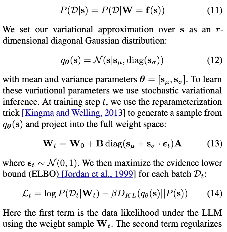 其中,D是训练(或微调)数据集,W是模型参数。然而,在将这类方法扩展到大语言模型(LLMs)时,由于 W的维度极高,对这一不可行积分进行良好近似变得愈发困难。因此,近期的研究考虑在一些流行的参数高效微调(PEFT)方法所学习的较小参数子集上进行贝叶斯推理 [Fu 等, 2023]。