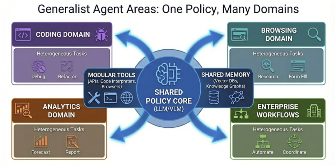 特点:旨在解决跨领域的异构任务(编码、浏览、企业工作流),使用共享的策略核心加上模块化的工具和记忆。 挑战:长期任务中错误会累积,工具失败(如搜索错误、代码编译失败)主导了错误来源。评估不仅要看最终答案是否合理,更要看整个执行轨迹是否可靠。 解决方案:使用检索增强生成(RAG)获取证据,使用模块化工具路由(MRKL)分离语言理解和专用工具,并使用 ReAct 进行轨迹化推理。