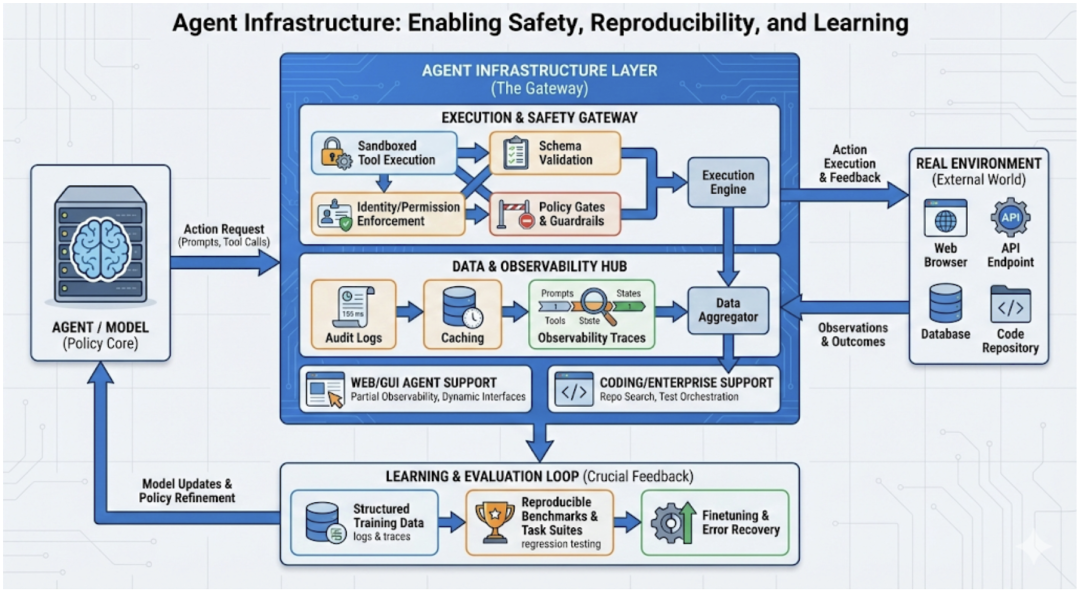 部署基础设施:安全关键的部署需要沙盒执行、模式验证、身份/权限执行、审计日志等。对于 Web 和机器人代理,这包括模拟器或安全的浏览器环境,以防止恶意操作。