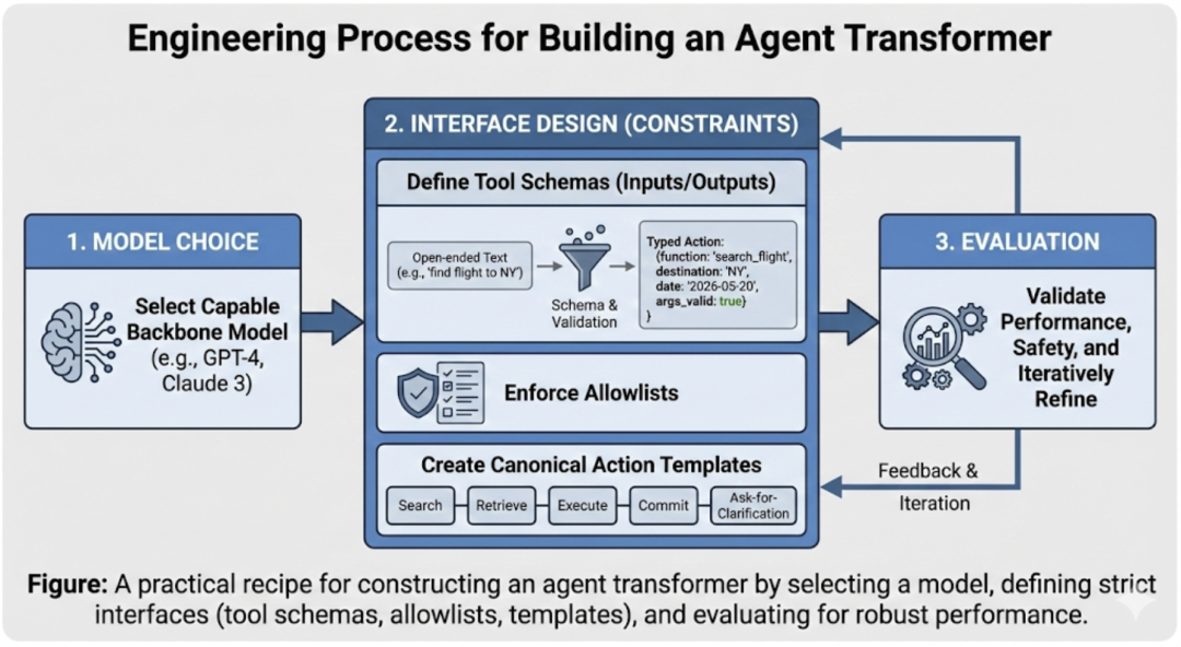 2、约束接口:定义工具模式(输入/输出),强制执行允许列表(Allowlist),并创建一组规范的动作模板(如搜索、检索、执行、询问澄清)