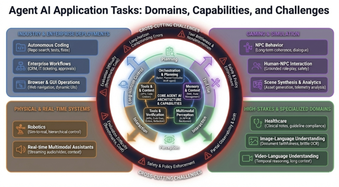 Agent 系统正在将大语言模型从被动的聊天伙伴转变为主动的工作流执行者,跨越了文本生成的边界,深入到软件工程、网页操作、企业自动化、机器人控制和多模态交互等多个领域。