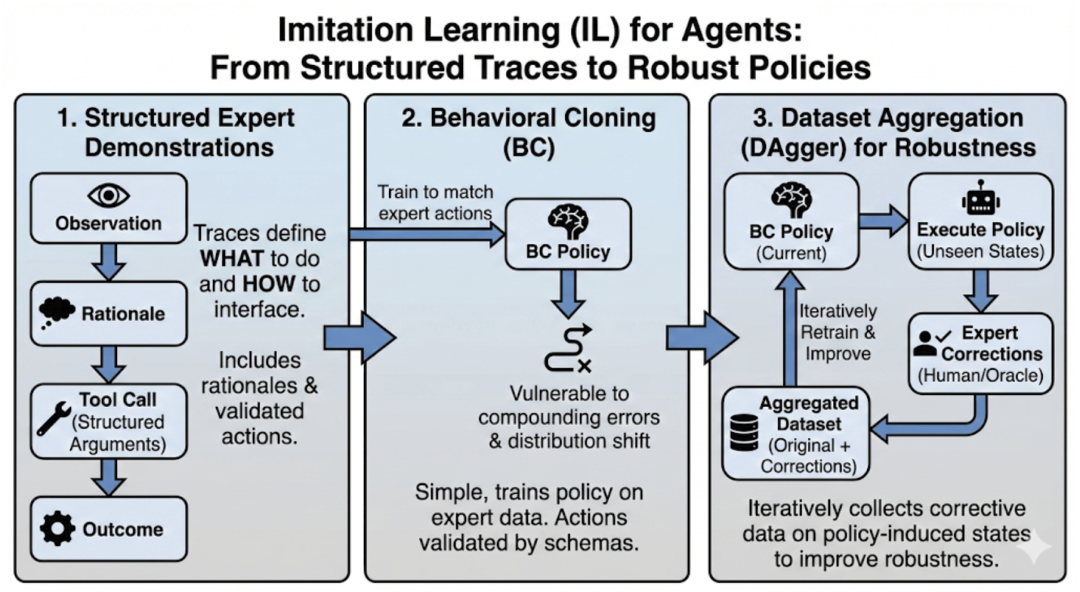 模仿学习(IL):IL 是一种务实的途径,当有专家演示(如人类记录的轨迹)时。行为克隆(Behavioral Cloning)训练策略匹配专家动作,但易受分布漂移(Compounding Errors)的影响。DAgger 等方法通过在学习策略诱导的状态上收集纠正演示来缓解这个问题。