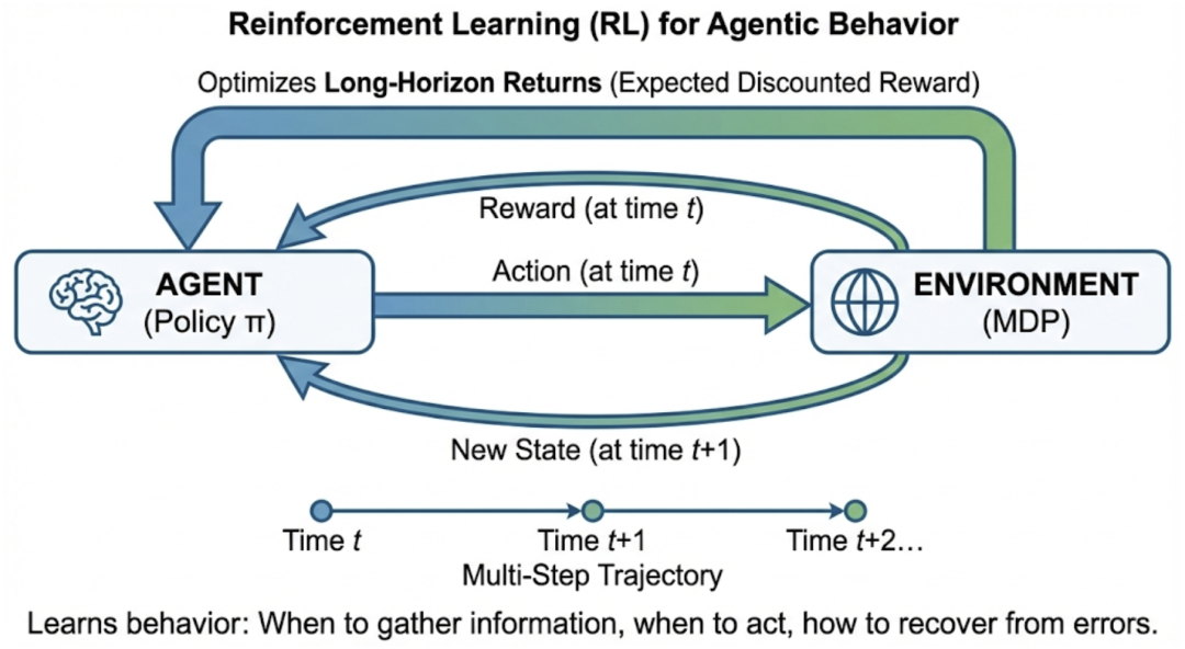 强化学习(RL):RL 是代理行为的自然选择,因为它直接优化长期回报(通常形式化为马尔可夫决策过程),学习何时收集信息、何时行动以及如何在多步轨迹中恢复。然而,RL 在工具丰富的真实环境中面临瓶颈:奖励稀疏、回滚成本高、工具调用代价高,这促使采用离线 RL 或安全 RL。