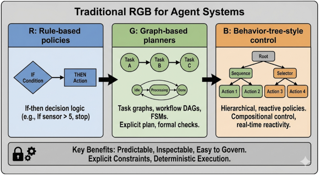 传统 RGB(规则/图/行为树):在 RL/IL 之前,许多生产系统依赖于传统的基于规则的策略和行为树,因其可预测性和易审计性而被保留,用于约束关键的安全行为。