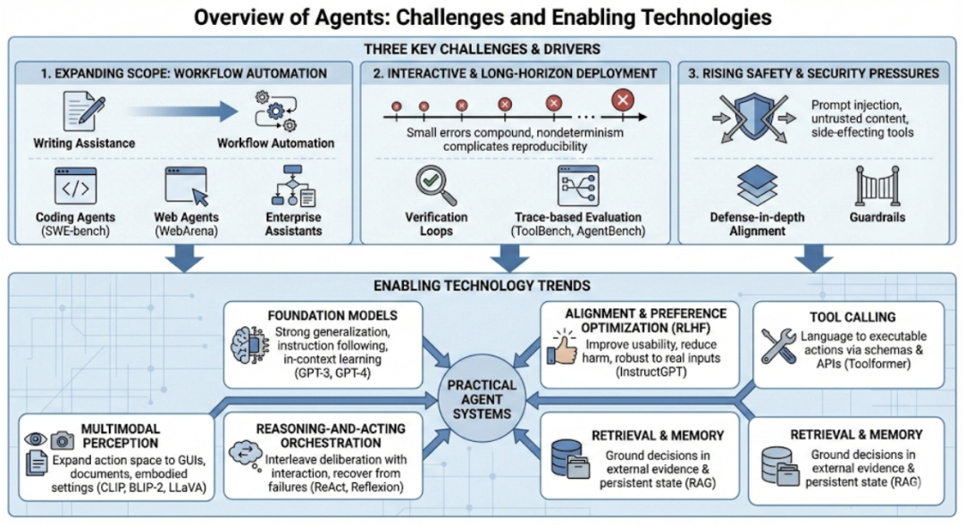同时,也点出了几个还没解决的开放问题:比如如何给工具调用加上可靠的护栏,怎么管理可扩展的记忆和上下文,如何让 Agent 的决策过程可解释,以及在真实负载下,怎么保证评估是可复现的。