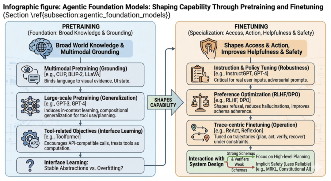 微调:指令微调和对齐(如 RLHF)是关键,塑造模型的帮助性和安全性。工具使用学习可以是显式的(在轨迹上微调)或隐式的(通过强化学习从工具反馈中学习)。