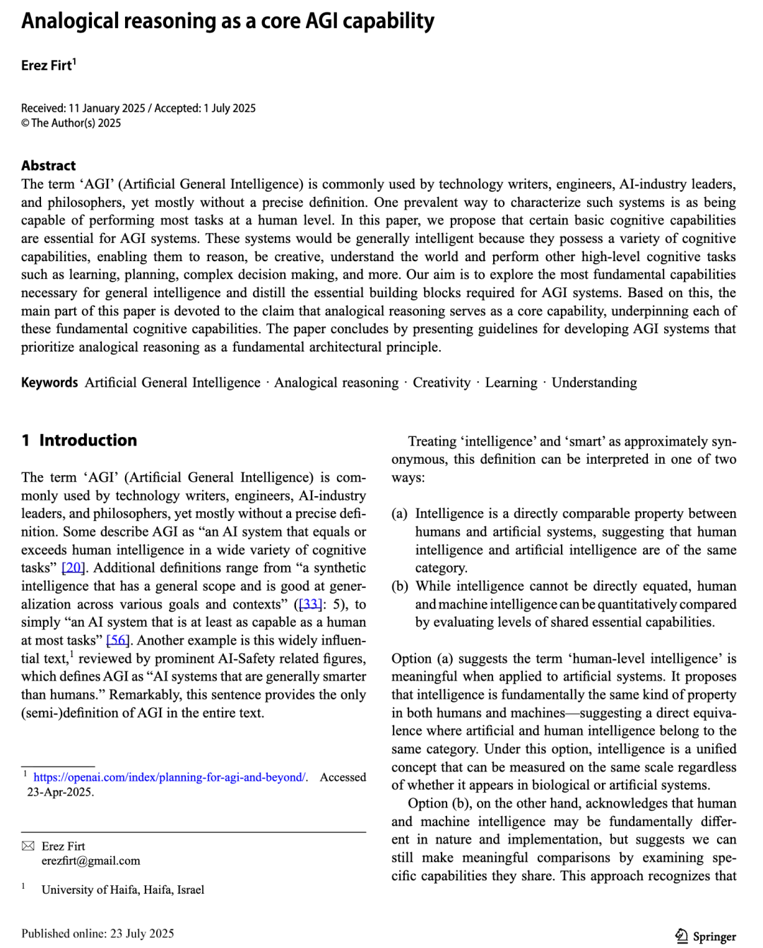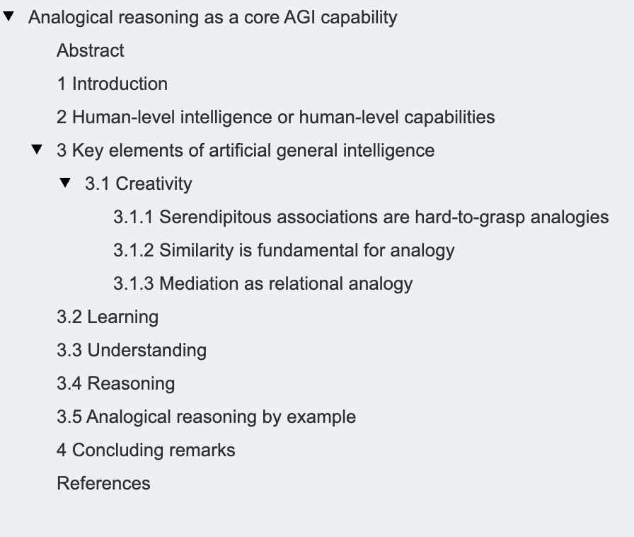 摘要 “通用人工智能”(AGI)这一术语被科技作家、工程师、人工智能行业领袖以及哲学家广泛使用,但通常缺乏精确的定义。一种常见的描述此类系统的方式是:它们具备在大多数任务上达到人类水平的能力。在本文中,我们提出,某些基本的认知能力对于通用人工智能系统而言是必不可少的。这些系统之所以具有通用智能,是因为它们具备多种认知能力,使其能够进行推理、创造、理解世界,并执行其他高级认知任务,例如学习、规划、复杂决策等。我们的目标是探讨实现通用智能所必需的最基本能力,并提炼出构建通用人工智能系统的本质构成要素。基于此,本文的核心论点是:类比推理是一种核心能力,它支撑着上述每一项基本认知能力。文章最后提出了开发通用人工智能系统的指导原则,强调应将类比推理作为系统架构的一项基本设计原则。