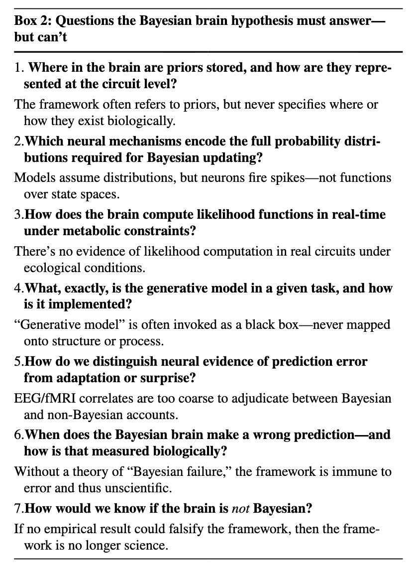 如果这项实验未能证实所预测的计算过程,那么强贝叶斯主张将彻底崩溃。如果支持者拒绝提出或执行这样一项决定性实验,或再次退回到无限的“仿佛”语言,那本身就构成了最终的、默认的让步:贝叶斯大脑并非认知的实现性模型,而只是一种修辞装饰——作为隐喻有价值,但作为机制性解释在科学上是惰性的——一个对失败免疫的观念,因而不适合科学。