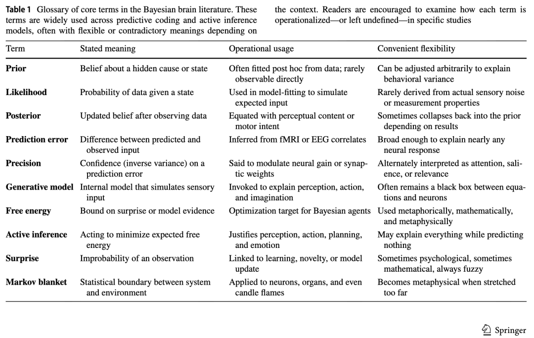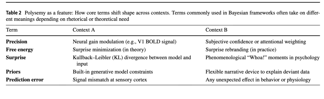 为澄清贝叶斯大脑假说在不同实现形式中的修辞与概念滑移,表1总结了核心术语及其在不同语境、模型层级与叙事意图下的含义变化。表2进一步扩展这一观点,展示这些术语如何常常随语境彻底转变含义——同时承担技术性、修辞性与隐喻性功能。
