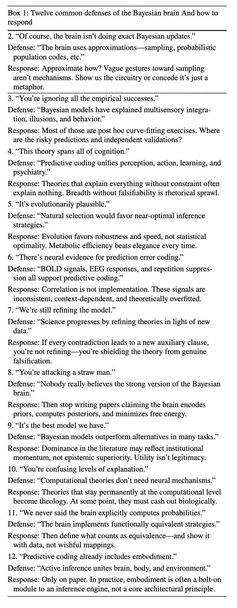 Box 1:贝叶斯大脑的十二种常见辩护及其应对方法