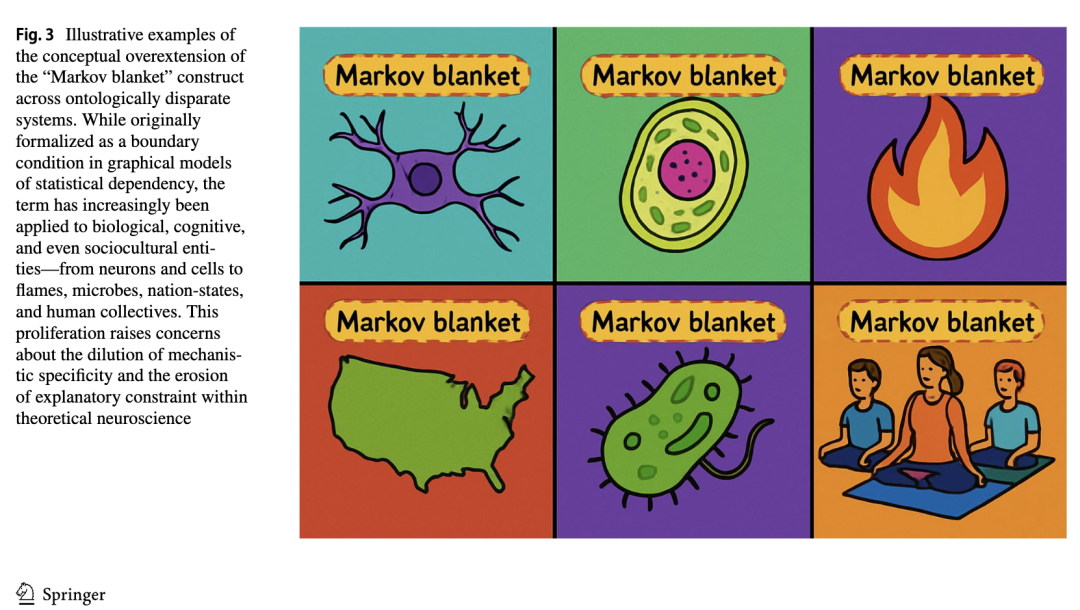 首先,我们必须认识到,贝叶斯大脑假说尽管影响广泛且数学上复杂,但当它抛弃了科学最核心的两项要求——可证伪性与机制性基础时,就有滑向伪科学的风险。支持者必须明确具体的神经实现方式和可证伪的预测,以维护其科学的严谨性。例如,证伪应包括识别出系统行为持续违背贝叶斯预测的条件——比如,当神经群体在面对意外刺激时未能发出预测误差信号,或在先验信息明确且相关的情况下,行为却完全忽略先验概率。尽管一些预测编码和主动推断模型已被用于模拟观察到的神经反应,但这类模拟通常依赖事后调整的先验和自由参数,而非提出具有风险性的先验预测,因而无法被明确证伪。例如,研究者不应仅仅声称“知觉遵循贝叶斯原则”,而应识别出具体表征概率分布的神经元群体,并明确这些分布如何通过突触机制进行更新。特别是卡尔·弗里斯顿(Karl Friston)的自由能原理,亟需更清晰的操作性定义,并明确说明何种证据才构成对其的否定。尽管“马尔可夫毯”(图3)和“生成模型”等术语常被呈现为机制性概念,但它们往往只是抽象的形式化表达,未能直接映射到特定的神经生理结构或过程。