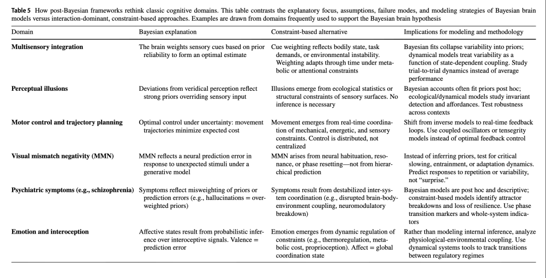 如果贝叶斯大脑假说未能兑现其对认知的机制性解释承诺,其原因并非缺乏数学上的优雅,而在于它未能捕捉生物系统的具身性、动态性和以互动为核心的本质。超越这一范式,并不意味着放弃严谨性或预测能力,而是将理论重心从“推断”转向“互动”,从“静态先验”转向“演化中的约束”,从“内部表征”转向“系统动力学”。替代方案并非混乱,而是一种更 grounded(扎根现实)、更具经验生成力的、以约束驱动动力学为核心的科学。为了超越单纯的批判,表5提供了并列示例,展示基于约束的动力学方法如何重构那些传统上以贝叶斯假设建模的核心经验领域。这些重构方向催生了新的建模策略、假设和经验问题。