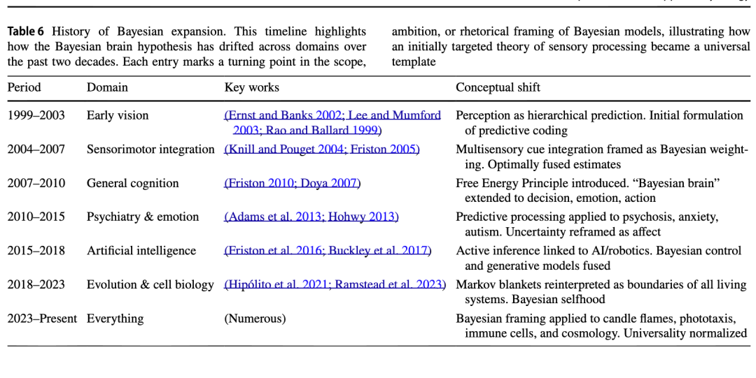 本附录按时间顺序概述了贝叶斯大脑假说在各领域的扩展过程(见表6)。以下内容不仅是一条时间线,更是一幅修辞地图,描绘了一个理论扩张过快、以致未能被批判性消化的过程。该时间线既可作为历史参考,也可作为一则警示故事。