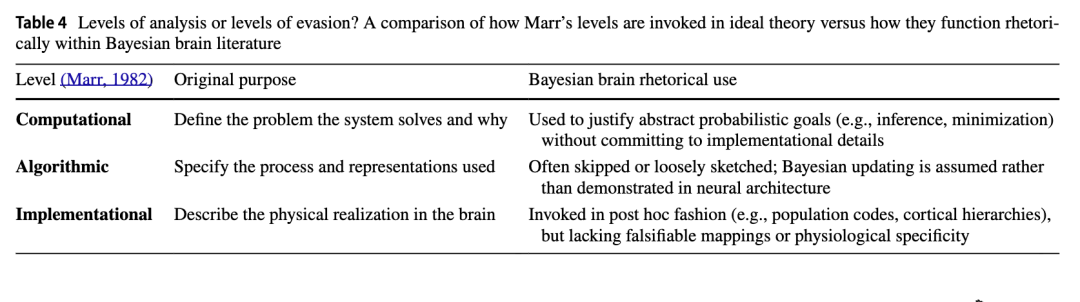 这并不意味着贝叶斯大脑假说毫无科学价值,而是说其主导地位不能仅用其经验或解释上的成功来解释。要全面理解它在当代神经科学中的地位,必须同时关注其理论内容与社会语境(Firestein 2012;Longino 2020)。其韧性的关键之一在于,它在不同解释层次之间穿梭,却常常不明确承诺于任何一层。这种策略性滑移常被诉诸马尔框架所掩盖——马尔框架本应澄清解释层次,却反而成为一种修辞上的“逃生口”。如表4所示,这种在马尔(1982)分析层次之间的策略性滑移,使支持者能够在不放弃理论权威的同时,逃避经验上的责任。