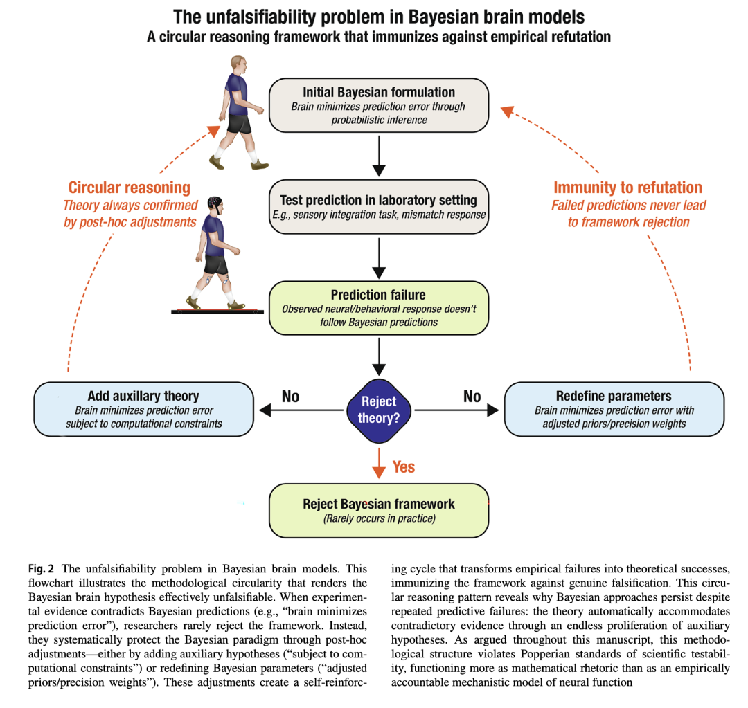这些问题与认知神经科学中长期存在的关于“不可证伪性”的批评密切相关,尤其是针对那些高度抽象、数学形式复杂的理论框架。自由能原理(FEP)整合并扩展了贝叶斯大脑假说,也因此成为此类批评的焦点。正如Williams(2020)和Colombo 与 Wright(2021)有力论证的那样,FEP 广泛的数学形式体系和概念上的弹性,使其几乎可以容纳任何经验结果,从而变得难以——甚至不可能——被证伪(见图2)。