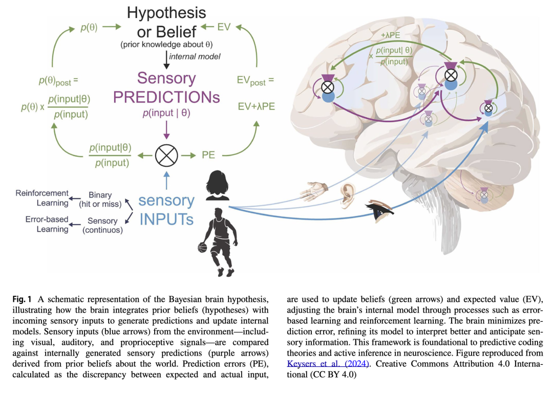 在此框架下,运动行为被视为通过改变感官输入以使其与预测对齐,从而最小化预测误差的尝试——这与感知中通过调整预测以匹配输入的做法相反(Adams 等 2013;Brown 等 2013;Friston 2011)。这一观点将运动控制重构为类似于感知的过程,二者均被理解为贝叶斯推理的形式。关键区别在于推理的方向:感知根据输入更新预测,而行动则修改输入以实现预测。