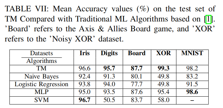 功耗权衡:TM在可解释性和鲁棒性方面持续优于传统机器学习模型,同时能耗极低。节能AI硬件(Energy-Frugal AI Hardware)[149]在乳腺癌数据集上以每数据点仅68.8皮焦(pJ)的能耗实现了97%的准确率,非常适合电池受限的环境。相比之下,基于FPGA的实现功耗显著更高。例如,用于在线学习的FPGA架构[147]在IRIS数据集上功耗达1.725瓦,其中板载微控制器占1.4瓦。而基于学习自动机的AI硬件[145]在二值化IRIS数据集上仅消耗1.85毫瓦。尽管功耗更高,该FPGA在线学习实现的IRIS准确率仅为79.5%,原因是缺乏针对数据集的充分优化。类似地,基于TM的FPGA加速器[153]在推理时功耗为1.8瓦,训练时为2.0瓦;而另一款推理加速器[154]在推理时功耗为2.709瓦,训练时为2.529瓦。