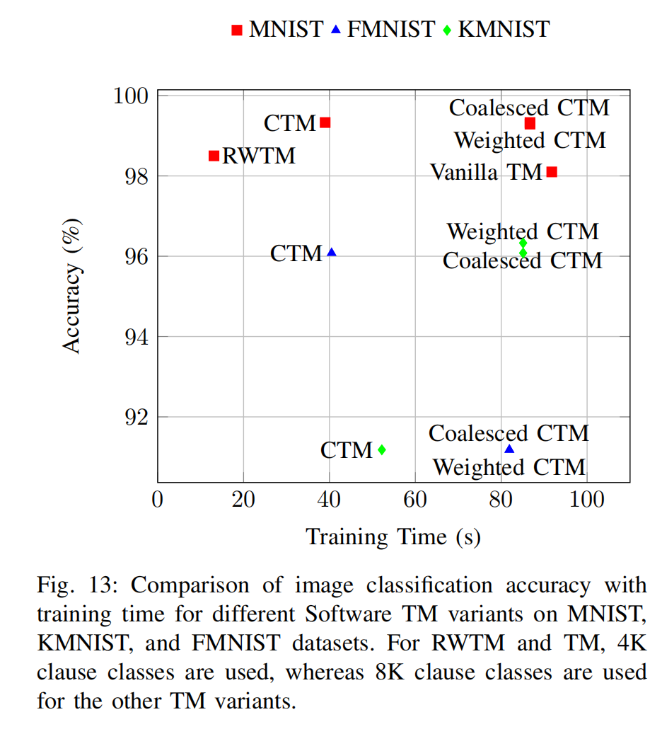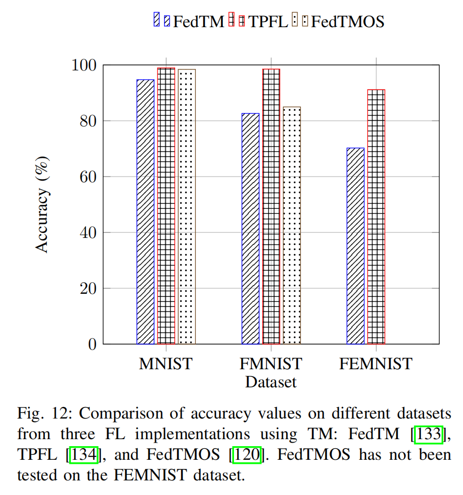 这些实现的一个显著缺点是其可扩展性不足;在处理大规模数据集或高维输入空间时,训练过程可能变得低效。有时,生成的规则不再易于解释,违背了TM追求可解释性的初衷。这种低效性源于需要手动调整超参数,例如自动机的状态数量和反馈参数,这些参数对性能有显著影响。另一个局限性在于,TM在细粒度任务(如图像分割和目标检测)中的潜力尚未得到充分探索。一项对比分析(图12)表明,TPFL在多个数据集上的表现 consistently(持续地)优于FedTM。FedTMOS在通信效率与性能之间提供了最佳权衡,尤其适用于无服务器环境。在使用TM软件模型进行图像分类的方法中(图13),融合型卷积TM(Coalesced CTM,即ConvCoTM)在MNIST上取得了最高的准确率,加权卷积TM(Weighted CTM)表现相近,而随机加权TM(RWTM)则训练速度最快,且准确率具有竞争力。