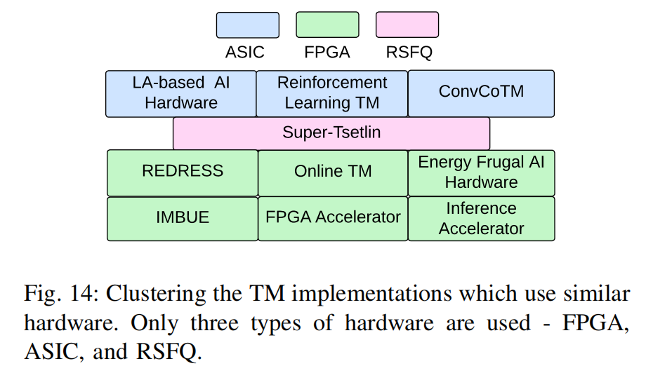 • 与以往仅关注TM学习特定方面的比较研究不同,本文广泛讨论了TM在分类、自然语言处理、强化学习(RL)等各类应用,以及FPGA和ASIC加速器、异步TM架构、能效型边缘AI等专用硬件实现中的应用。