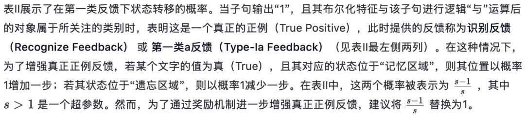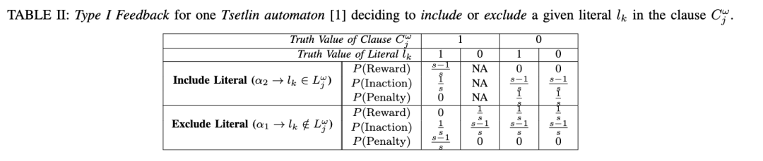 Tsetlin机(TM)中的每个子句都是一条规则。子句的数量 m通常通过网格搜索(grid-search)根据数据集的复杂性确定。所有这些规则都是独立且并行地学习的。在TM内存中,所有文字(literals)初始时被设置在“遗忘”和“记忆”状态之间的分界处,表示“即将被记住但当前仍处于遗忘状态”。为了学习一条描述某对象属于特定类别(例如 ω)所需特征的规则(即子句),存在两种反馈:一种是当该子句评估结果为“1”时的反馈,另一种是评估结果为“0”时的反馈。这两类反馈统称为第一类反馈(Type-I Feedbacks)。