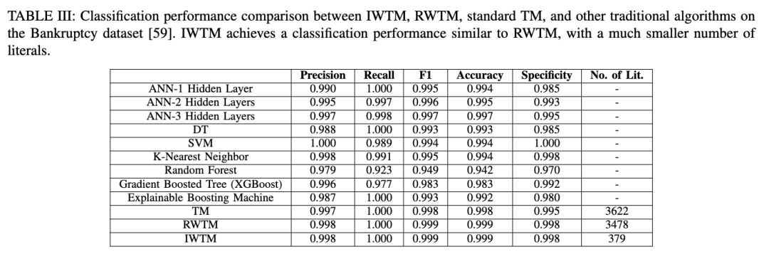 TM最初在文献[1]中被提出用于分类任务,并在某些分类数据集上表现出与传统机器学习算法相当甚至更优的效率,如表VII所示。自那以后,TM已被应用于多个学科领域的分类任务。例如,有研究引入了基于逻辑回归的置信度评分,取代硬性决策函数,从而实现预测结果的排序以及更敏感的曲线下面积(AUC)计算[60]。在整数权重Tsetlin机(Integer-Weighted TM, IWTM)中,通过整数加权子句紧凑地表示重复的子模式,提升了可解释性和效率,在内存占用极小的情况下实现了更优的F1分数[59](参见图6)。IWTM在使用最少的文字数量以及训练与测试总内存的前提下,其F1分数优于标准TM、实数权重TM(RWTM)以及其他传统算法(如表III所示)。