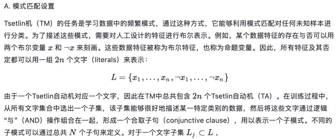 为了理解Tsetlin机(TM)如何作为现代神经网络的一种可解释替代方案,必须首先掌握其基本TM的模式学习算法。该算法的各个阶段,例如模式匹配设置、反馈、状态更新,以及使用训练后的状态位对测试特征集进行推理,将在下文逐一描述。
