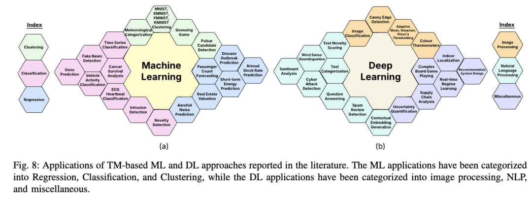 除了超向量TM,还出现了针对特定应用场景定制的TM模型,用于图像与文本理解。同时,基于TM的方法也被拓展至强化学习(RL)和联邦学习(FL)。尽管这些方法超出了传统深度学习的范畴,但由于其在计算机视觉和自然语言处理(NLP)任务中的良好适应性,仍将其归入本领域讨论。基于TM的深度学习算法的实际应用如图8(b)所示。