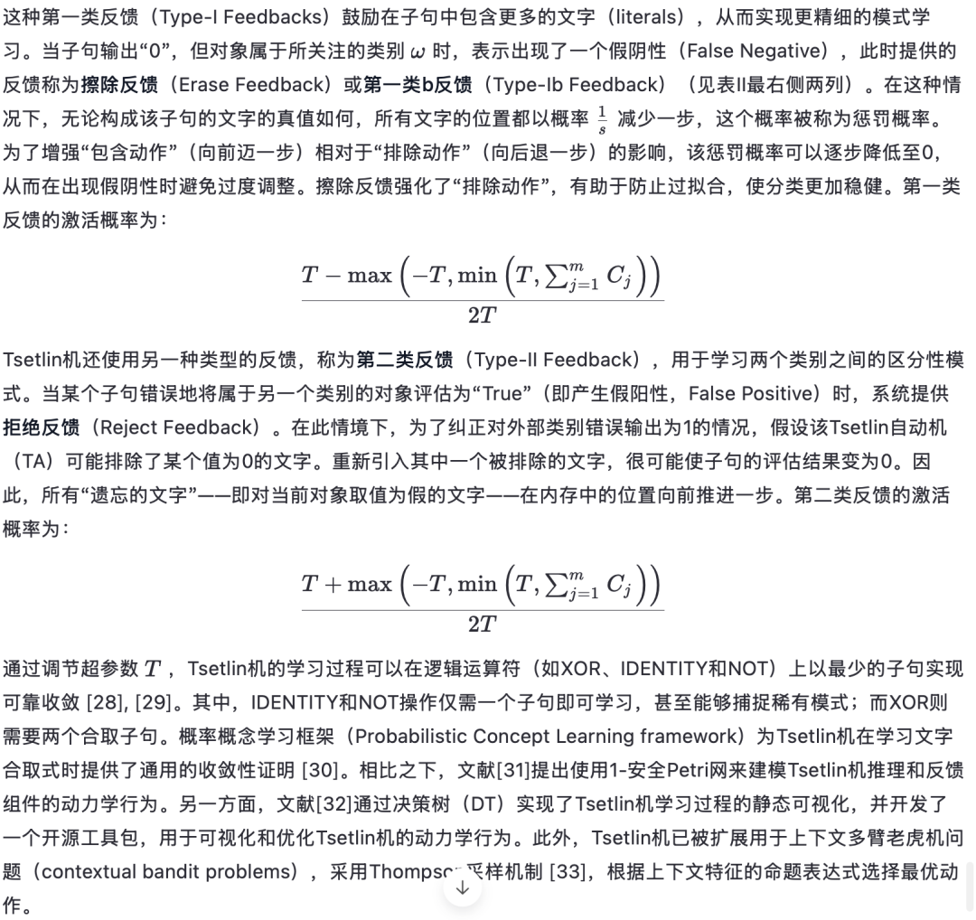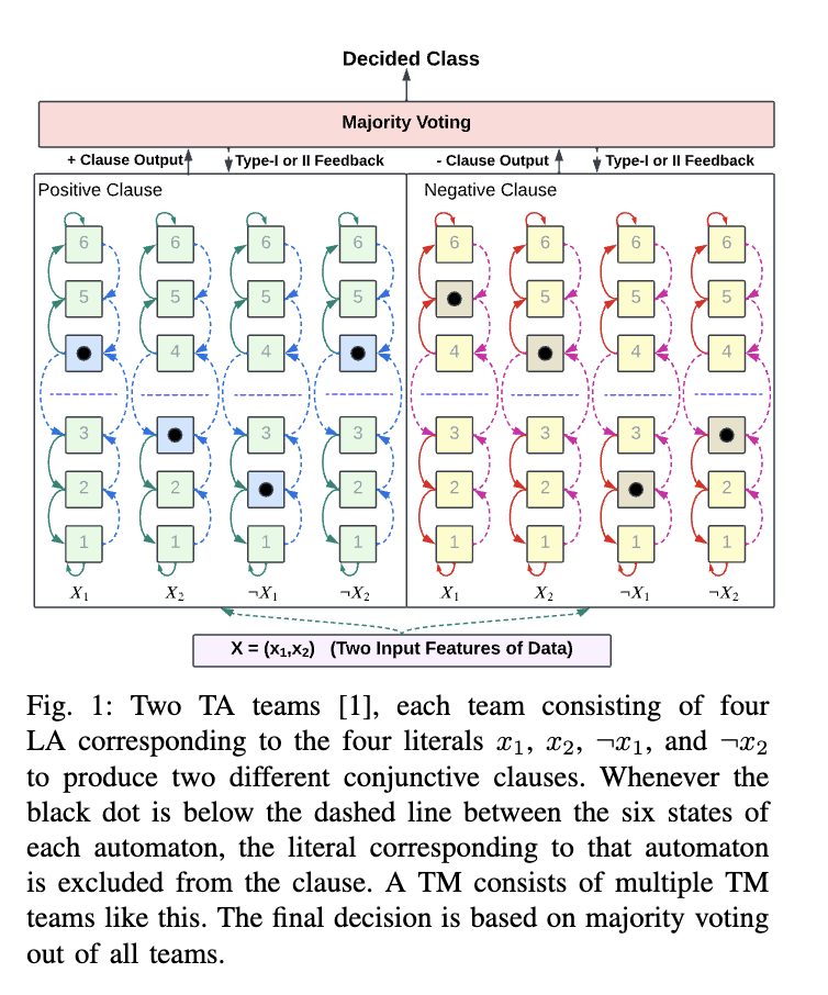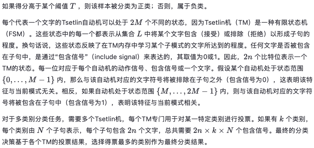 Tsetlin机:TM 是一种基于命题逻辑的决策算法,在此语境下,命题逻辑即指布尔代数。它由大量Tsetlin自动机(TA)组成。Tsetlin自动机是一种学习自动机(Learning Automaton)。在博弈论中,自动机是一种自我控制的计算单元,能够自动执行预定的动作序列。学习自动机则通过根据环境反馈更新动作概率来执行核心操作 [5]。由于TM由有限数量的学习自动机(LA)构成,因此也被称为有限状态机(FSM)。