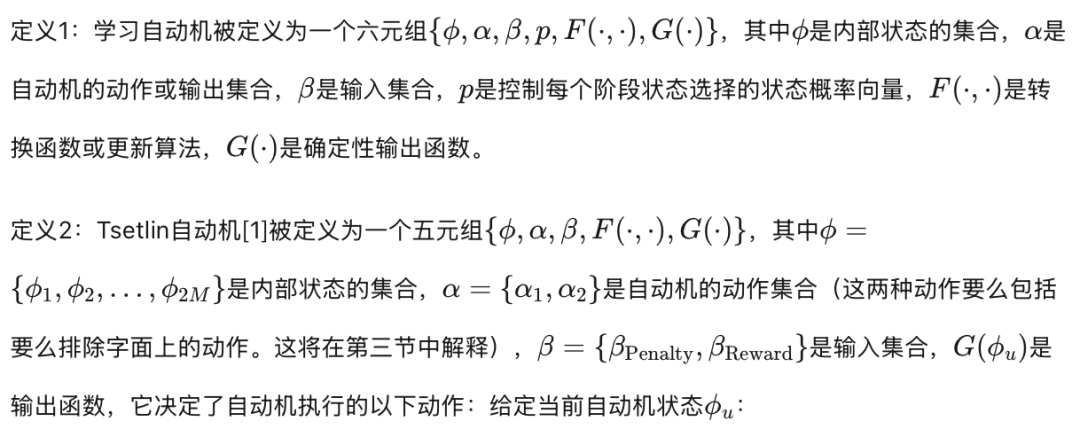由于Tsetlin自动机是第一个学习自动机[11],这里简要讨论了LA(学习自动机)如何先前被应用于模式识别问题。LA在未知的随机环境中做出最优决策。TA(Tsetlin自动机)由多个Tsetlin自动机构成。多个TA团队构成TM(Tsetlin机器)。为了完整性,下面定义了学习自动机和Tsetlin自动机。