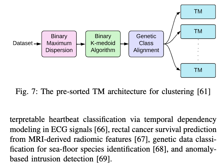 领域特定的分类应用: 基于TM的分类器已在多个不同领域得到应用。在生物医学领域,已有研究采用TM框架从心电图(ECG)信号中实现可解释的室性早搏检测[62];而聚合型IWTM(Coalesced IWTM)则利用布尔逻辑对原核生物基因进行DNA序列比对与预测[63]。另一种方法将TM应用于政治暴力预测,通过可解释的规则生成实现内战预测[64]。