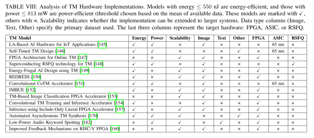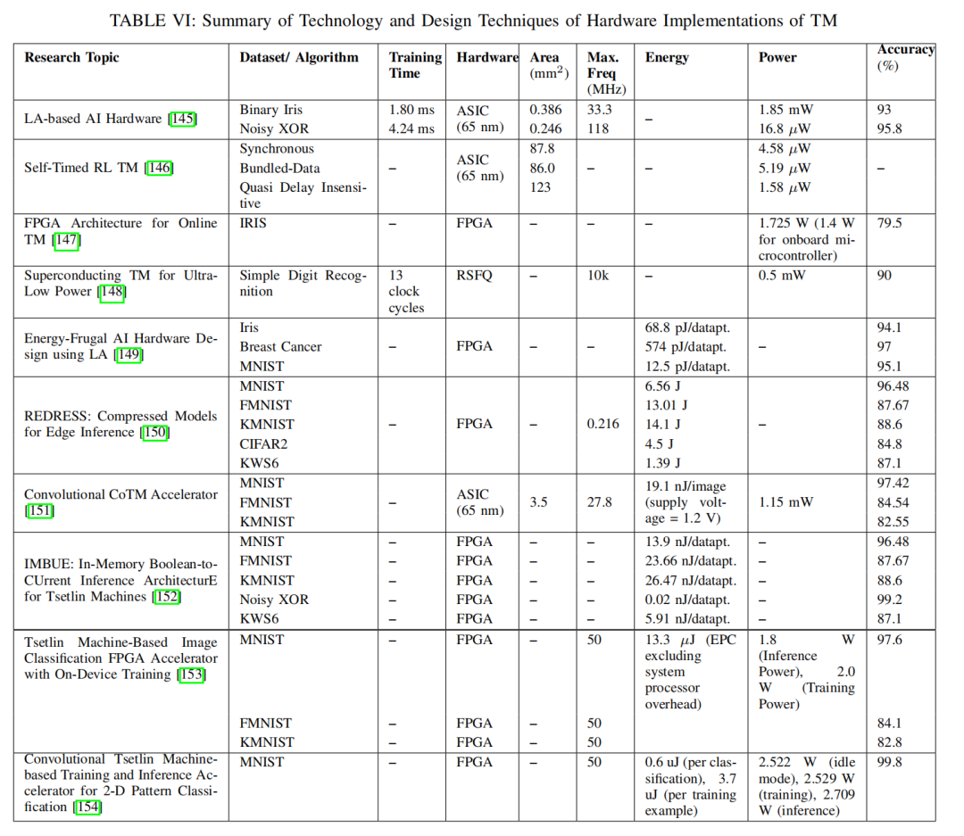 其他分析:TM中仅包含文字(include-only literal)的设计[157]可优化推理性能,但对于需要动态训练或更复杂子句结构的多样化应用缺乏可扩展性。绿色TM(Green TM)通过减少内存使用,适用于资源占用低的边缘计算场景。然而,其优化集中在框架层面,未直接解决硬件特定挑战,如能效或推理速度。