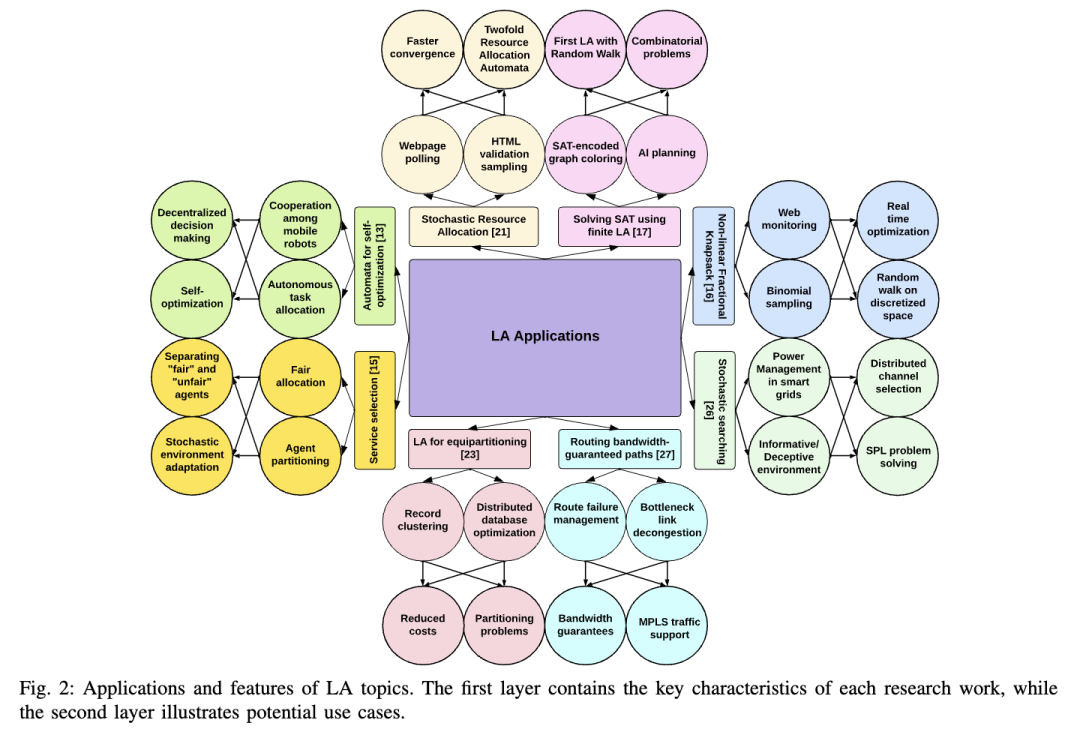 Tsetlin自动机(TA)支持在噪声环境中进行在线学习。具体而言,TA能够解决多臂老虎机问题 [20]。TA的应用已扩展到多个领域,例如:两级资源分配自动机的层次结构用于资源分配 [21],Ommen等人提出的在线随机搜索(Stochastic Searching on the Line, SSL)算法 [22],等分划分 [23],用于社交活动网络的流式采样算法 [24],基于树状转移的随机游走-跳跃链分析 [25],在欺骗性环境中的分层SSL [26],以及用于多协议标签交换网络中带宽保障路径计算的自适应在线路由算法 [27]。图2总结了学习自动机在不同领域的应用。在下一节中,将详细阐述基于Tsetlin机的学习与推理过程。