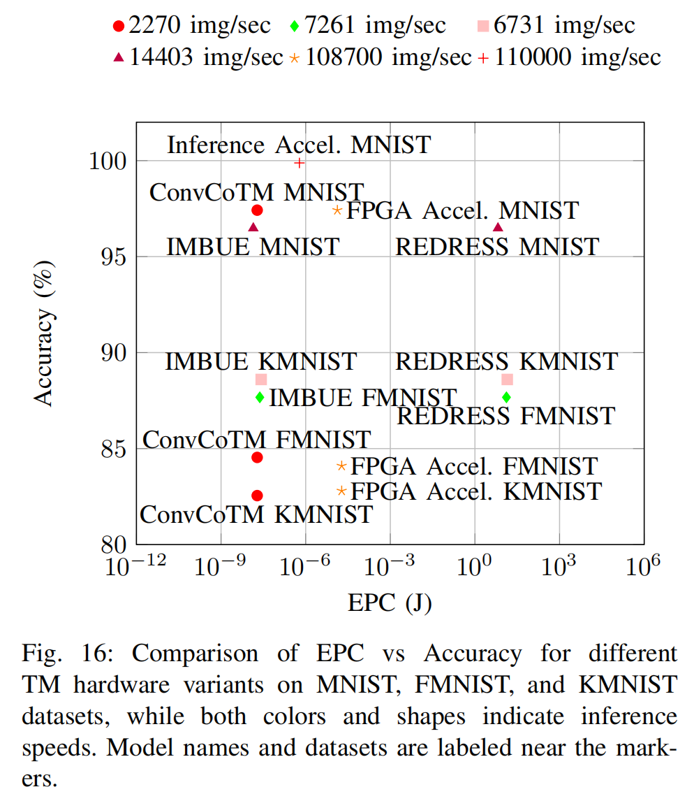 实验观察:图像分类仍是TM在软件和硬件中最广泛实现的应用。图16展示了硬件实现中每周期能耗(EPC)与准确率的趋势,其功耗分别为:1.15毫瓦(卷积CoTM加速器)、1.8瓦(推理)、2.0瓦(训练)(基于FPGA的图像分类加速器)、2.522瓦(空闲与推理)(卷积TM训练与推理加速器)。文献[154]中的实现在推理速度、准确率和能效之间达到了最佳平衡。