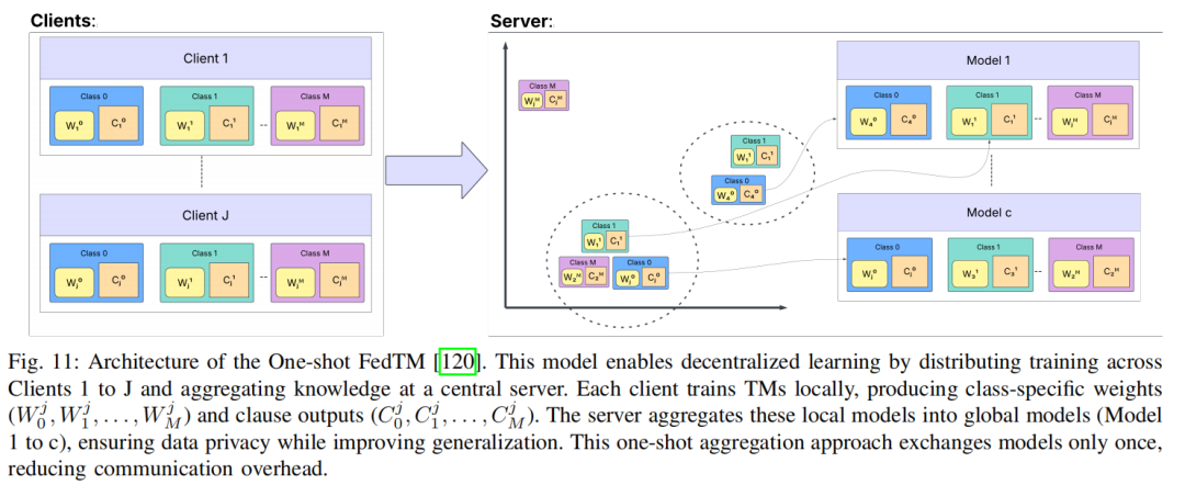 联邦学习:TMs已被适配用于联邦学习(FL),重点在于降低通信开销并提升去中心化环境下的模型效率。FedTM[133]提出了一种两步聚合技术,结合TopK和AverageCW方法,实现基于比特的子句权重聚合,相比传统联邦学习框架[135]显著降低了通信成本(1.37–7.6倍)和内存使用(2.93–7.2倍),同时在非独立同分布(non-IID)数据集上保持了良好的鲁棒性。为应对一次性联邦学习(One-Shot FL)中的延迟和资源限制问题,FedTMOS[120]利用TM的类别自适应特性,在无需服务器端训练的情况下对类别特定权重进行聚类和重新分配。该方法将上传成本降低了2.3倍,服务器延迟减少了75倍,并在准确性上比基于集成的一次性联邦学习方法高出7.22%。针对个性化联邦学习,TPFL[134]引入基于置信度的聚类机制,仅共享类别特定权重,从而改善对non-IID数据的处理能力。该方法在MNIST(98.94%)和Fashion-MNIST(98.52%)上实现了高准确率,同时显著降低了通信开销。