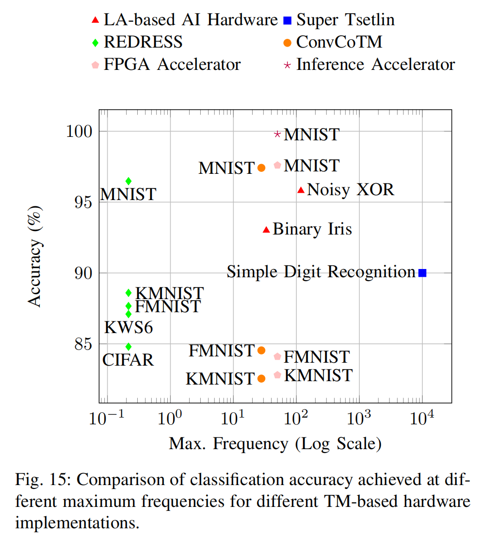图15比较了不同TM硬件模型的准确率与工作频率,包括:基于学习自动机的AI硬件[145]、超导TM[148]、REDRESS[150]、卷积CoTM加速器[151]、支持设备端训练的FPGA加速器[153]、以及2D模式分类加速器[154]。更高的工作频率并不总能提升准确率——Super-Tsetlin尽管运行在10 GHz,但表现不佳。高效能的基于FPGA的TM和ConvCoTM在中等频率下实现了最优准确率,适合实时应用。低频的REDRESS模型在不同数据集上保持稳定,但在复杂特征提取(如CIFAR)任务中表现较差。表VIII总结了在能效、可扩展性和技术选择方面的权衡,强调TM硬件的成功取决于通过架构优化在准确率与效率之间取得平衡。