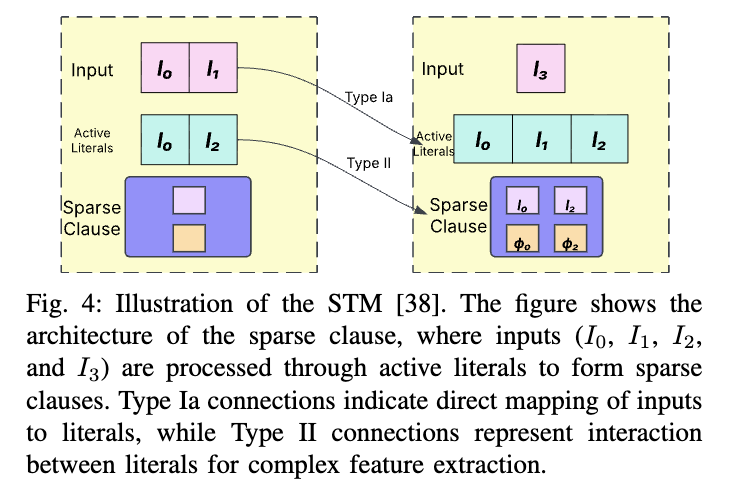 4)节能型与稀疏型TM变体: 通过用多步有限状态自动机替代随机TA,可降低功耗,实现可控的能效-精度权衡[46]。进一步的效率提升可通过循环平稳随机数序列实现,在降低随机性分辨率的同时保持鲁棒性[47]。稀疏Tsetlin机(Sparse TM, STM)[38]仅激活相关文字符号,从而减少内存消耗(参见图4)。另一种STM变体通过引入吸收态TA(absorbing TA states),在训练过程中动态剪除不必要的文字,实现更快的学习速度和更低的能耗[48]。此外,将TA重构为三动作自动机,可同时做出“包含”与“排除”决策,分别减少36%的资源占用和39%的功耗[49]。