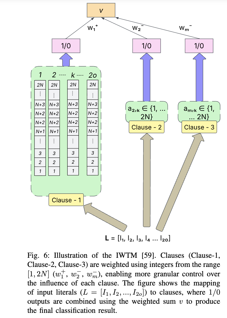 其中 j = 1, ..., N。在这 N 个子句中,有 N/2 个是正子句,包含有助于预测某一特定类别的特征;另外 N/2 个是负子句,包含描述样本不属于某一特定类别的特征。当正子句的条件满足时,它们对分类决策起正面促进作用;而当负子句的条件满足时,它们则对分类决策起负面抑制作用。在训练过程中,空子句的输出为“1”,而在推理阶段,其输出为“0”。此外,如果一个子句包含的文字过多,说明它未能学习到适用于该类所有对象的泛化子模式,从而导致过拟合;相反,如果一个子句包含的文字过少,则意味着该子句未能完整捕捉该类对象的全部特征(文字),从而导致欠拟合。