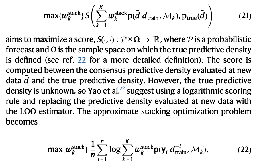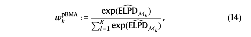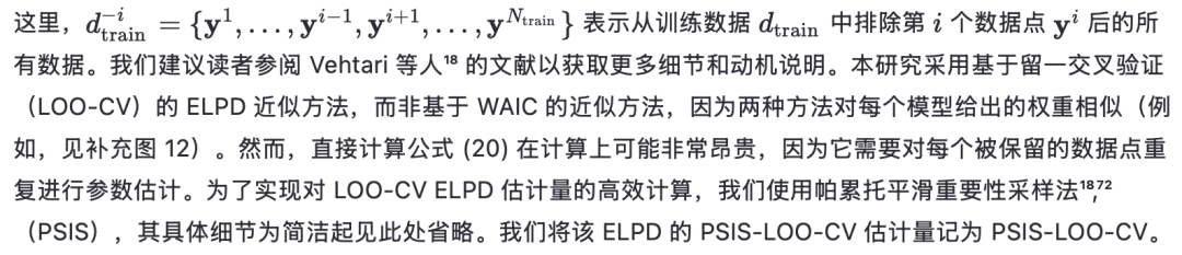 伪贝叶斯模型平均(Pseudo-Bayesian model averaging)根据模型对未来数据的预期预测性能来对模型进行加权,该性能通过“期望对数逐点预测密度”(ELPD)进行衡量。类似于使用AIC代替ELPD的赤池型加权法14,我们将标量形式的伪贝叶斯模型平均(pseudo-BMA)权重定义为: