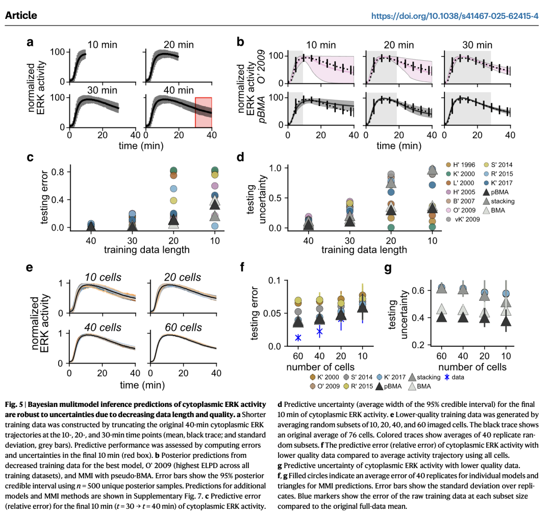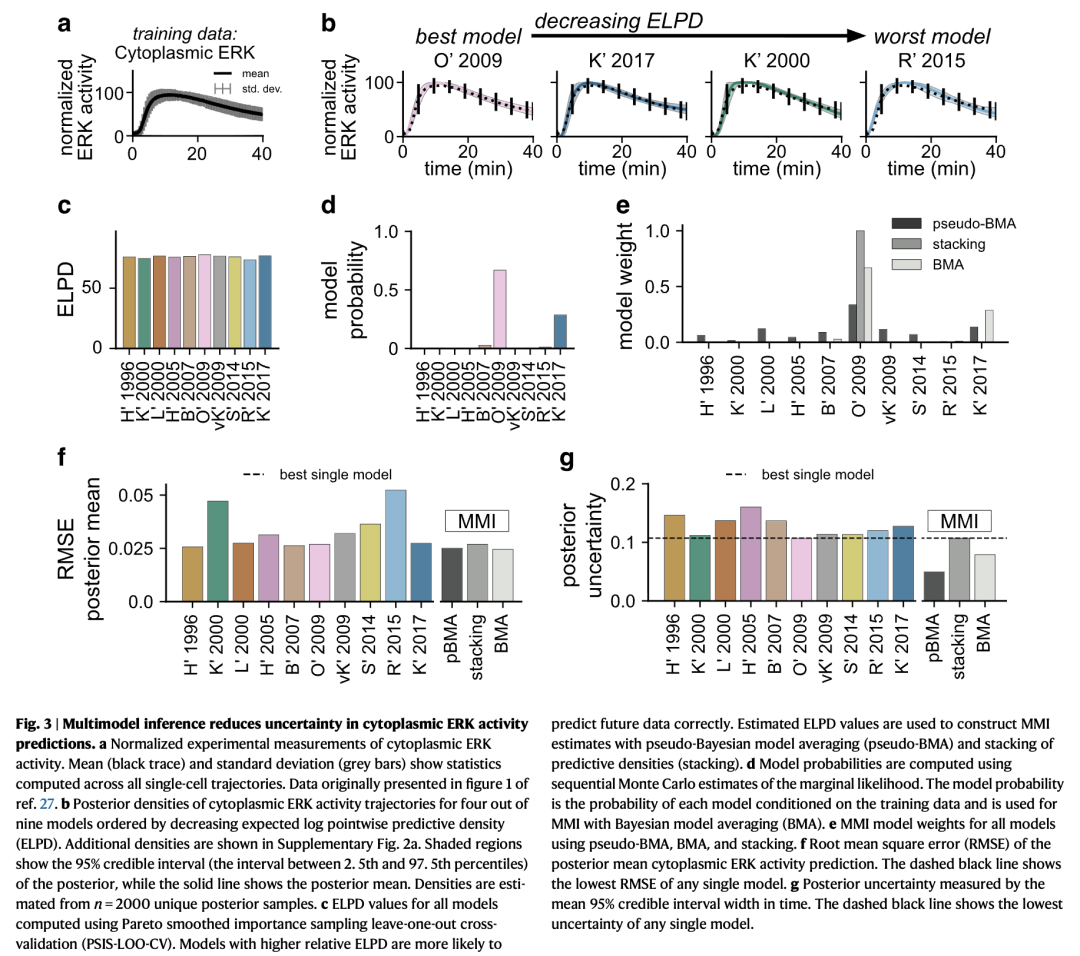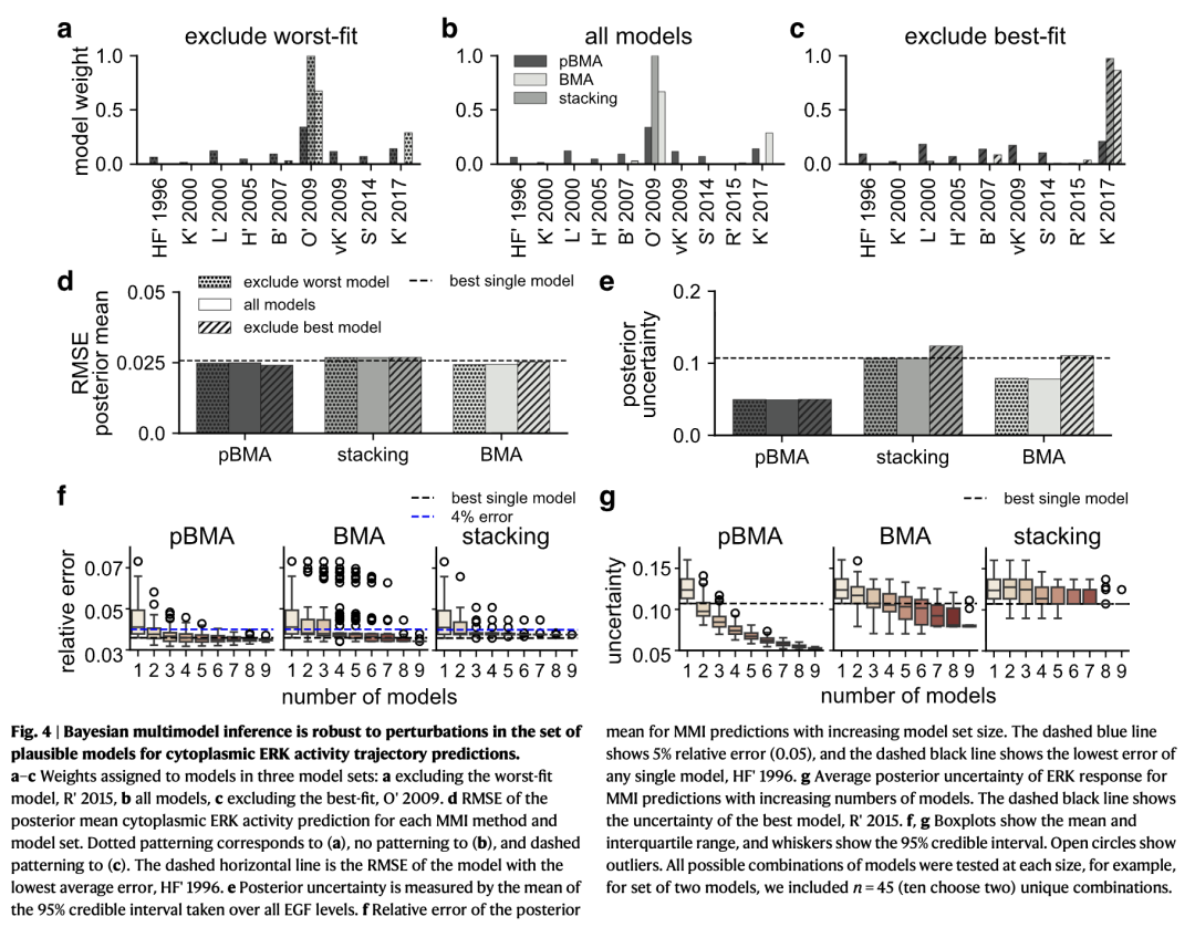 从定量角度来看,不同方法的预测结果存在差异:只有伪贝叶斯模型平均(pseudo-BMA)和贝叶斯模型平均(BMA)提高了预测的确定性。pseudo-BMA 和 BMA 方法的后验均值的均方根误差(RMSE),以及通过后验95%可信区间平均宽度衡量的预测不确定性,均略低于单个最佳模型(图 3f, g)。然而,堆叠法的这些指标与最佳单模型相同,因为它仅对单一模型赋予权重。这些结果表明,对细胞质 ERK 活性的多模型推理预测不仅保持了最佳模型的预测准确性,而且在采用加权平均时还能降低预测不确定性。