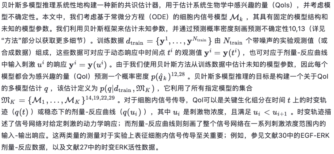 此前在系统生物学中应用MMI的研究主要局限于少数几种可用方法,尤其是基于信息准则和BMA的方法。Stumpf等人对生物网络推断中的MMI进行了理论分析,其中网络结构由数据推断得出20,21。基于这些分析以及对蛋白质-蛋白质相互作用数据的有限应用,作者得出结论:选择一组高质量的模型对于构建准确的MMI估计至关重要,即使真实网络不在候选模型集合中,MMI仍能改善对生物网络结构的预测。最近,Beik等人使用BMA结合MMI,从多个实验数据集中筛选出与肿瘤生长机制一致的候选模型26。然而,MMI尚未被用于提高系统生物学中细胞内信号预测的确定性。