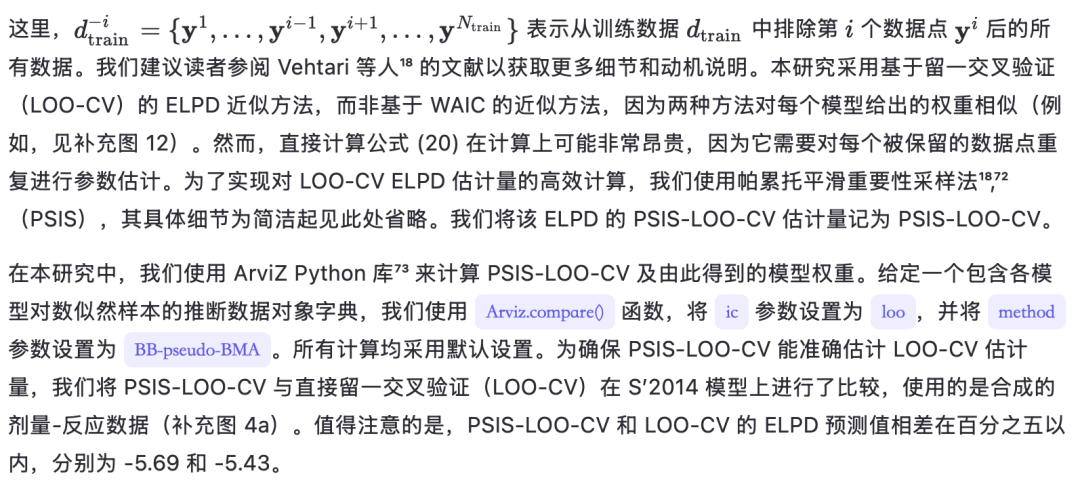在本研究中,我们使用 ArviZ Python 库⁷³ 来计算 PSIS-LOO-CV 及由此得到的模型权重。给定一个包含各模型对数似然样本的推断数据对象字典,我们使用 Arviz.compare() 函数,将 ic 参数设置为 loo,并将 method参数设置为 BB-pseudo-BMA。所有计算均采用默认设置。为确保 PSIS-LOO-CV 能准确估计 LOO-CV 估计量,我们将 PSIS-LOO-CV 与直接留一交叉验证(LOO-CV)在 S’2014 模型上进行了比较,使用的是合成的剂量-反应数据(补充图 4a)。值得注意的是,PSIS-LOO-CV 和 LOO-CV 的 ELPD 预测值相差在百分之五以内,分别为 -5.69 和 -5.43。