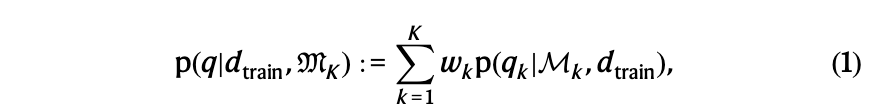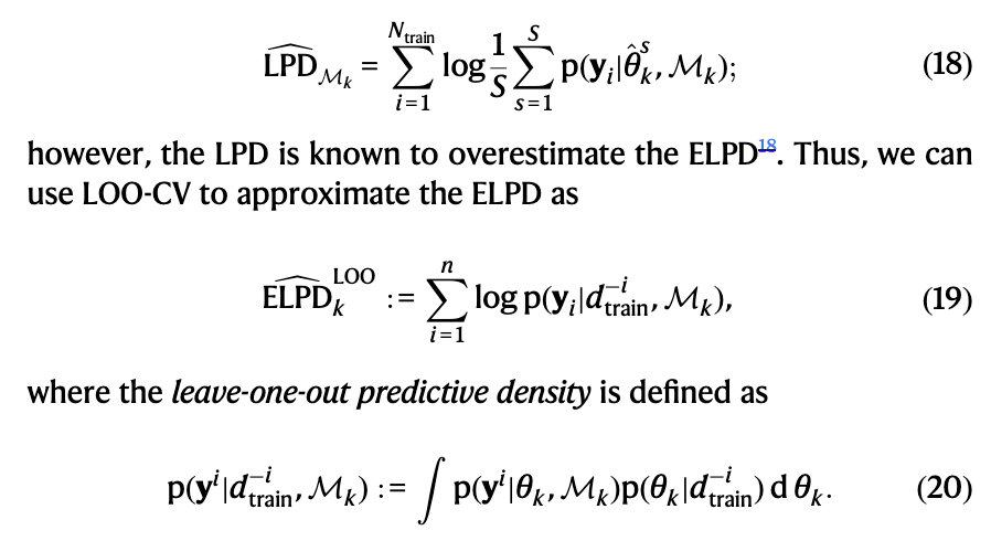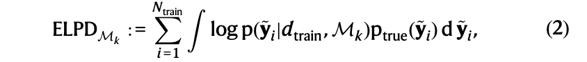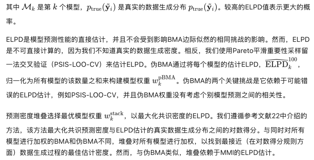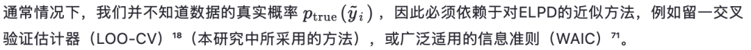 伪贝叶斯模型平均分配模型权重,基于未见数据的预期预测性能,通过预期对数点预测密度(ELPD)来衡量。ELPD通过计算预测和真实数据生成密度之间的距离来量化新数据的预期预测性能,并定义为: