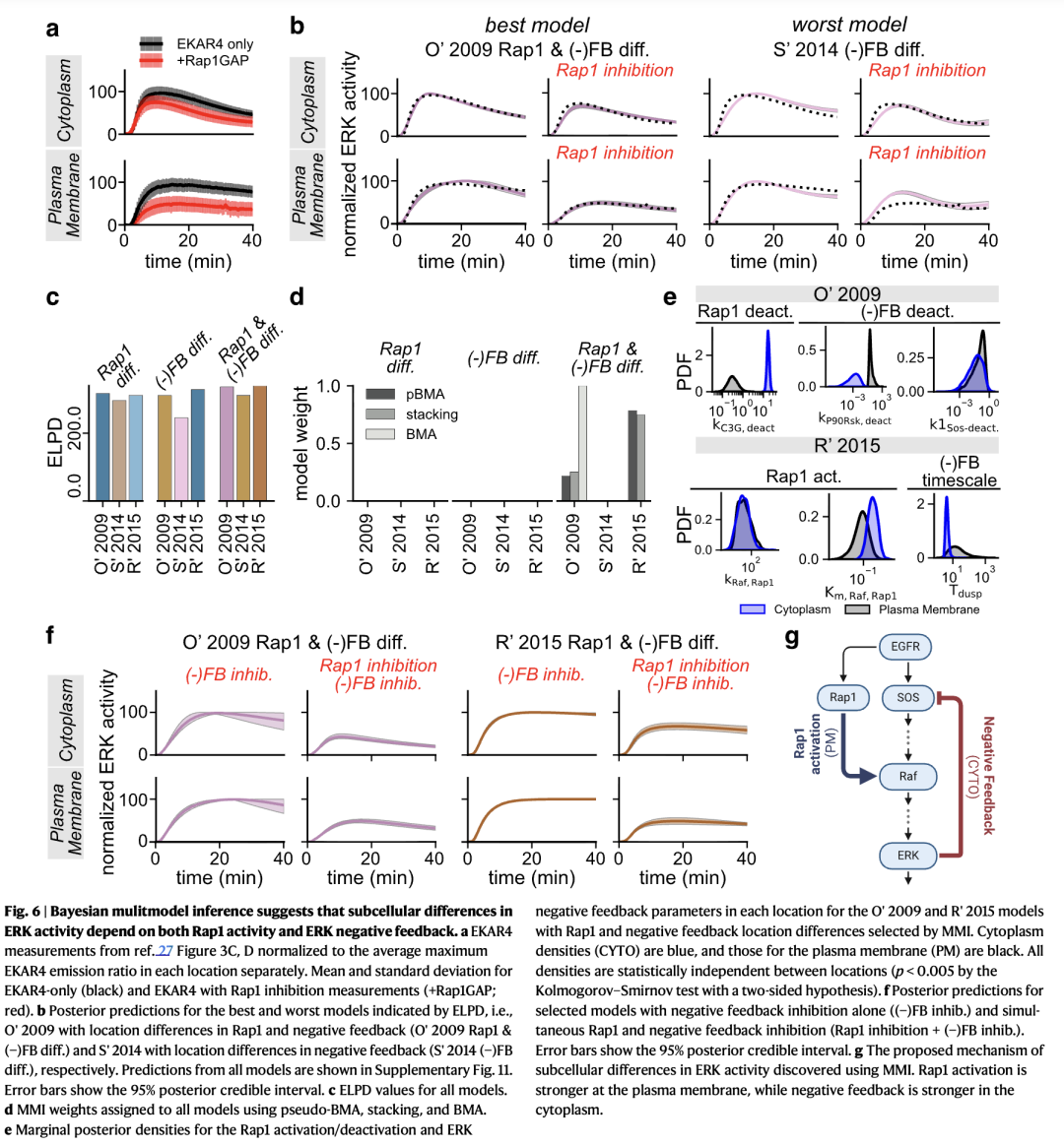 Keyes等人先前揭示了细胞质与细胞膜上ERK信号在时空上的差异27。具体而言,作者观察到,与细胞质相比,细胞膜上的ERK活性持续时间更长(图6a,黑色轨迹;数据源自参考文献27的图1C和1D)。此外,Keyes等人还表明,细胞膜上的ERK活性强烈依赖于非经典ERK激活因子Rap1,而细胞质中的活性则不依赖(参考文献27的图3C和3D)。在此,我们使用多模型推理(MMI)来探究模型参数的亚细胞特异性差异是否能够预测ERK活性的亚细胞变异,并筛选出能准确解释实验数据的模型。