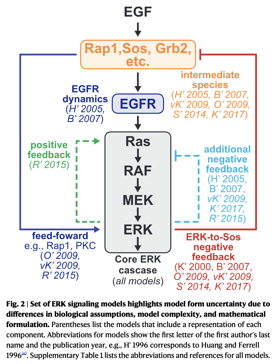 ERK 信号通路在调控多种细胞过程(包括增殖、生长、代谢和分化)中起着关键作用34,35。由于其广泛的重要性,ERK 是被建模最广泛的细胞内信号通路之一36。为了测试多模型推理(MMI)方法,我们选定了一组包含十个核心 ERK 信号网络模型的集合30,37–45。在整个研究中,我们以第一作者姓氏的首字母和发表年份来指代每个模型,例如 Huang 和 Ferrell 于 1996 年提出的模型记为 H’1996。尽管每个模型最初用于回答不同的研究问题,但我们选择这十个模型,是因为它们都完整地描述了从输入到 ERK 激活的 ERK 信号通路。图 2 展示了各个模型所覆盖的表皮生长因子(EGF)至 ERK 的信号网络,并标示出哪些模型包含了特定的结构组分。我们注意到,除了每个模型仅包含完整 ERK 信号网络的子集外,这些模型在机制复杂性和描述反应动力学所用的数学表达形式上也存在差异。例如,H’1996 仅使用质量作用动力学,而 K’2017 则结合了米氏方程(Michaelis-Menten)和希尔方程(Hill-equations)。此外,所有模型都采用单一方程表示 EGF-EGFR 相互作用,只有 H’2005 和 B’2007 采用了详细的多步配体结合和受体内化机制。补充表 1 显示,模型参数数量和状态变量数量的巨大差异反映了模型构建形式上的不同。此外,每个模型的方程均可从原始或二次文献中获得。因此,这些模型在真实世界中体现了建模的不确定性,同时在对 ERK 信号通路的描述上仍具有可比性。基于此,我们认为这组 ERK 模型是测试多模型推理(MMI)的理想案例。