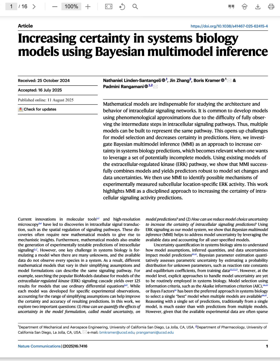 当前分子工具1,2 和高分辨率显微技术3,4 的发展推动了细胞内信号转导领域的发现,例如信号通路的空间调控。这些发现往往需要新的数学模型来提供机制性见解。此外,数学模型还能生成可实验验证的细胞内信号活动预测5–7。然而,系统生物学中的一个关键挑战是:当存在大量未知因素,且现有数据无法观测系统中所有组分时,如何构建模型。因此,针对同一条信号通路,可能产生多个在简化假设和模型结构上各不相同的数学模型。例如,在流行的BioModels数据库中搜索细胞外调节激酶(ERK)信号级联的模型,仅使用常微分方程的模型就超过125个8,9。尽管每个模型都是为特定实验现象而开发的,但若能综合考虑各种简化假设,则有助于提高预测的确定性和准确性。在本研究中,我们探讨两个重要问题:(1)如何量化模型结构不确定性(即模型不确定性)对模型预测的影响?(2)如何减少模型选择的不确定性,以提高细胞内信号预测的确定性?以ERK信号通路为模型系统,我们表明,贝叶斯多模型推断(MMI)通过利用现有数据并综合所有用户指定的模型,有助于应对模型不确定性。
