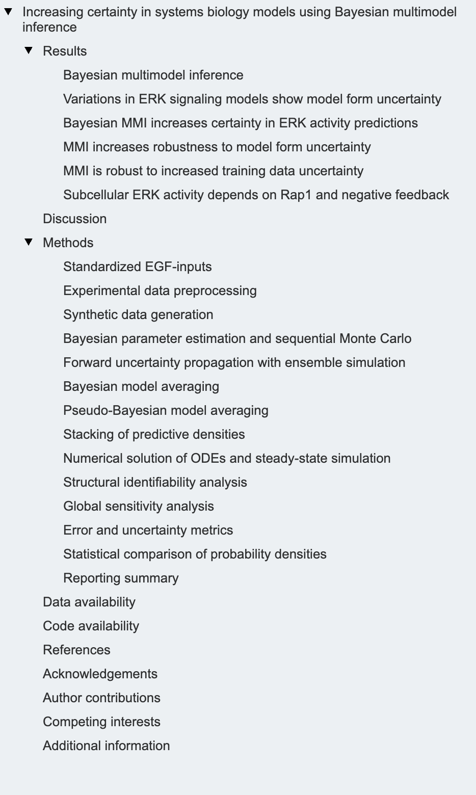 值得注意的是,本研究分析的三种MMI方法之外还存在其他替代方法。首先,我们选择聚焦于贝叶斯方法,而排除了使用赤池信息准则(AIC)或贝叶斯信息准则(BIC)等指标的频率学派方法14,18,因为贝叶斯方法提供的不确定性量化更适合系统生物学中数据有限的情况。在贝叶斯文献中,随机搜索变量选择51、概率密度融合24和可逆跳转MCMC52等方法也被提出用于多模型推理(更多方法参见文献19和18中的引用)。诸如集成估计(ensemble estimation)53等方法可产生与MMI类似的预测。因果推断54以及促进稀疏性的推断方法55–58可更直接地从数据中选择模型或机制。将基于MMI的模型选择与替代的数据驱动方法进行比较,有望进一步扩展系统生物学可用的工具。
